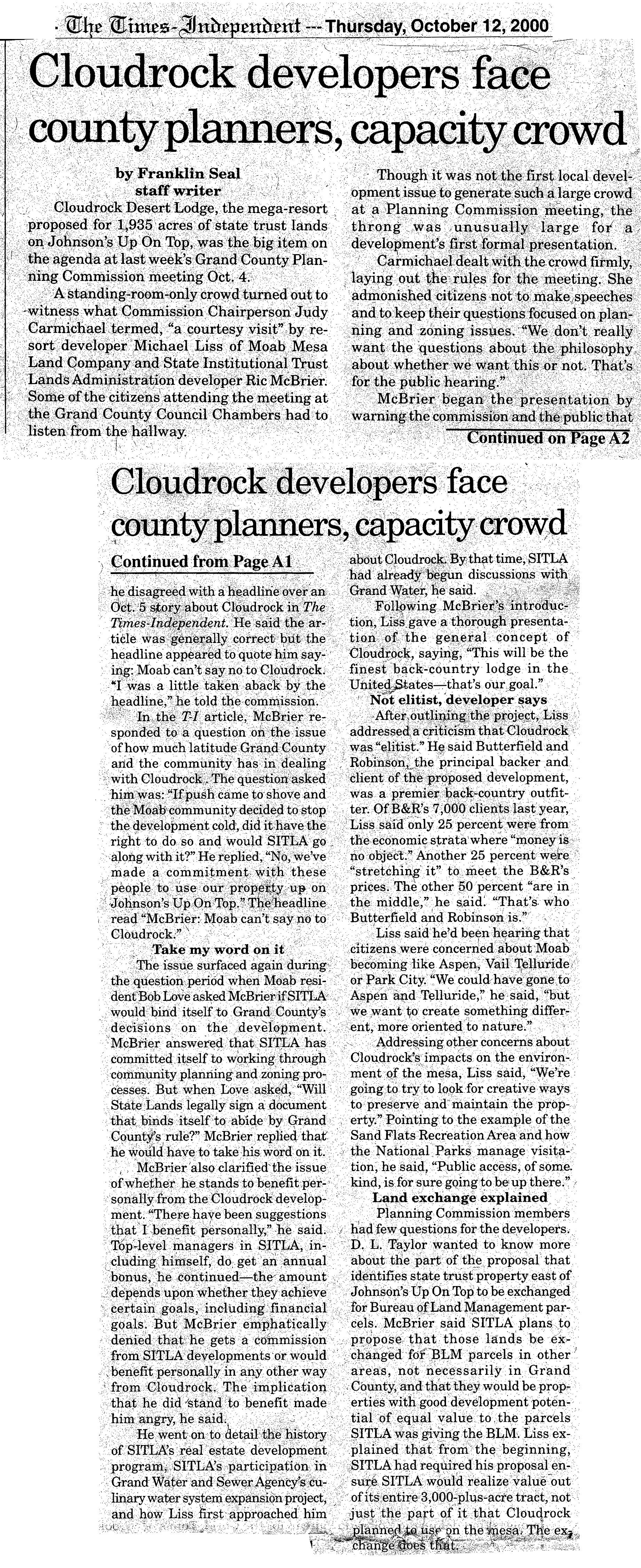 October 12, 2000 - Cloudrock developers face county planners, capacity crowd