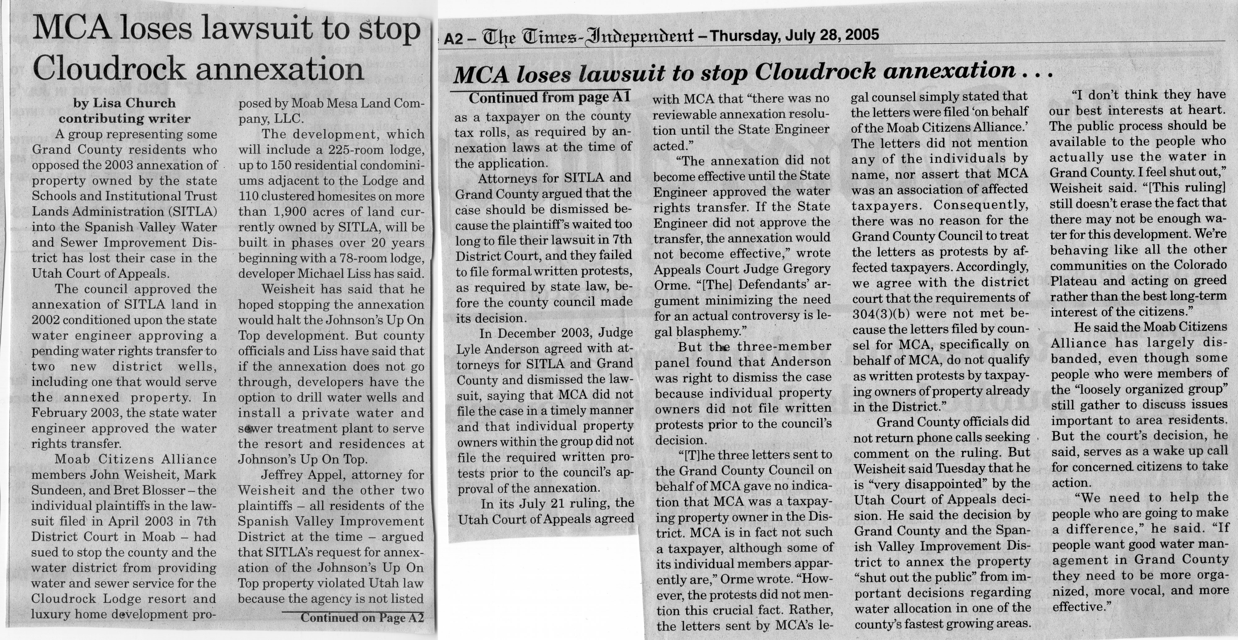 July 28, 2006 - MCA loses lawsuit to stop Cloudrock annexation