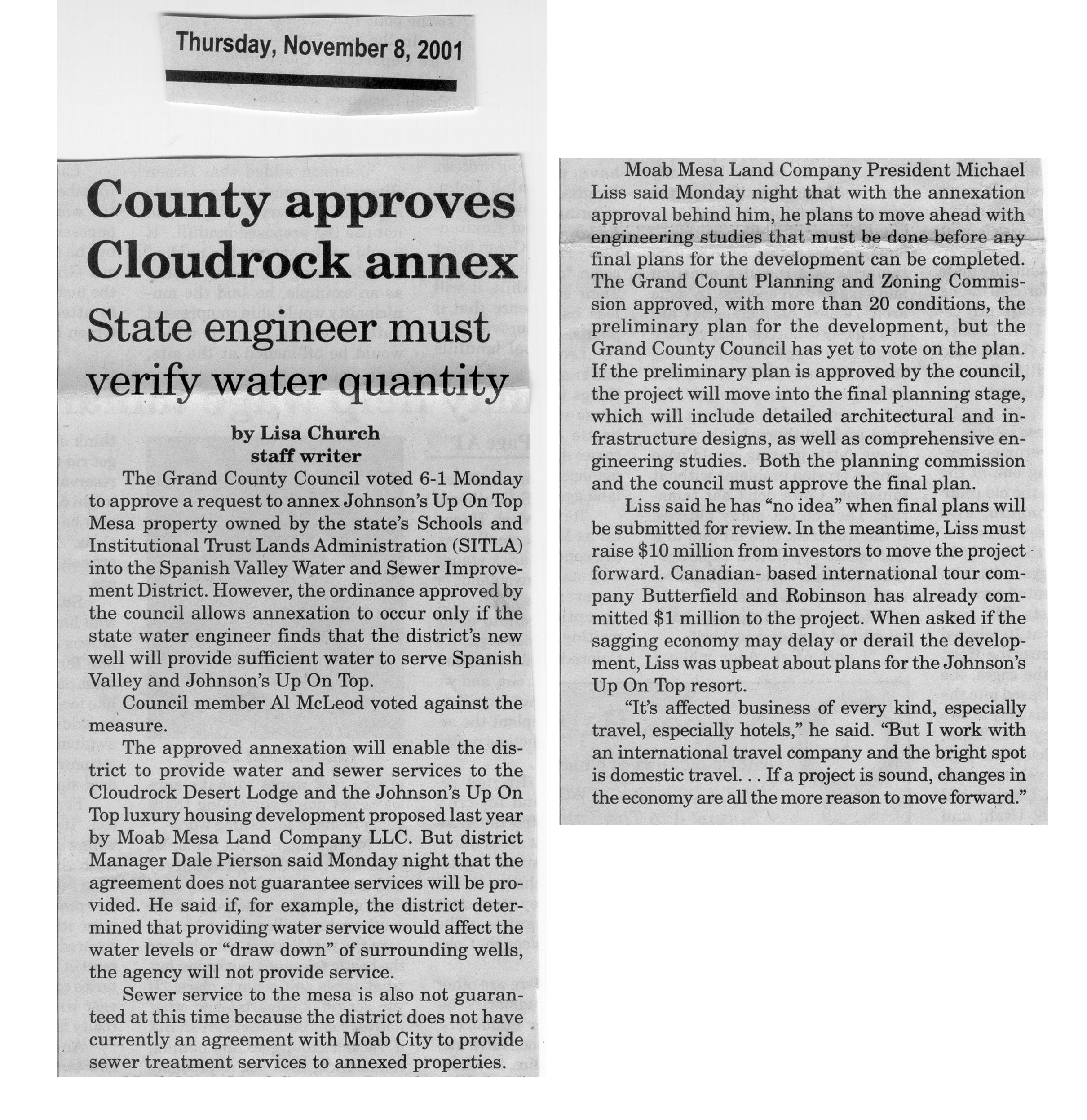 November 8, 2001 - County approves Cloudrock annex